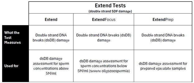 The Extend® test is similar to the Exact® in that it measures the level of DNA fragmentation in a sperm sample. However, unlike our Exact® test, which measures both single strand DNA breaks (ssDB) and double strand DNA breaks (dsDB), Extend® exclusively measures dsDB. dsDB in sperm cell DNA are more challenging to repair and often indicate deeper issues with spermatogenesis.