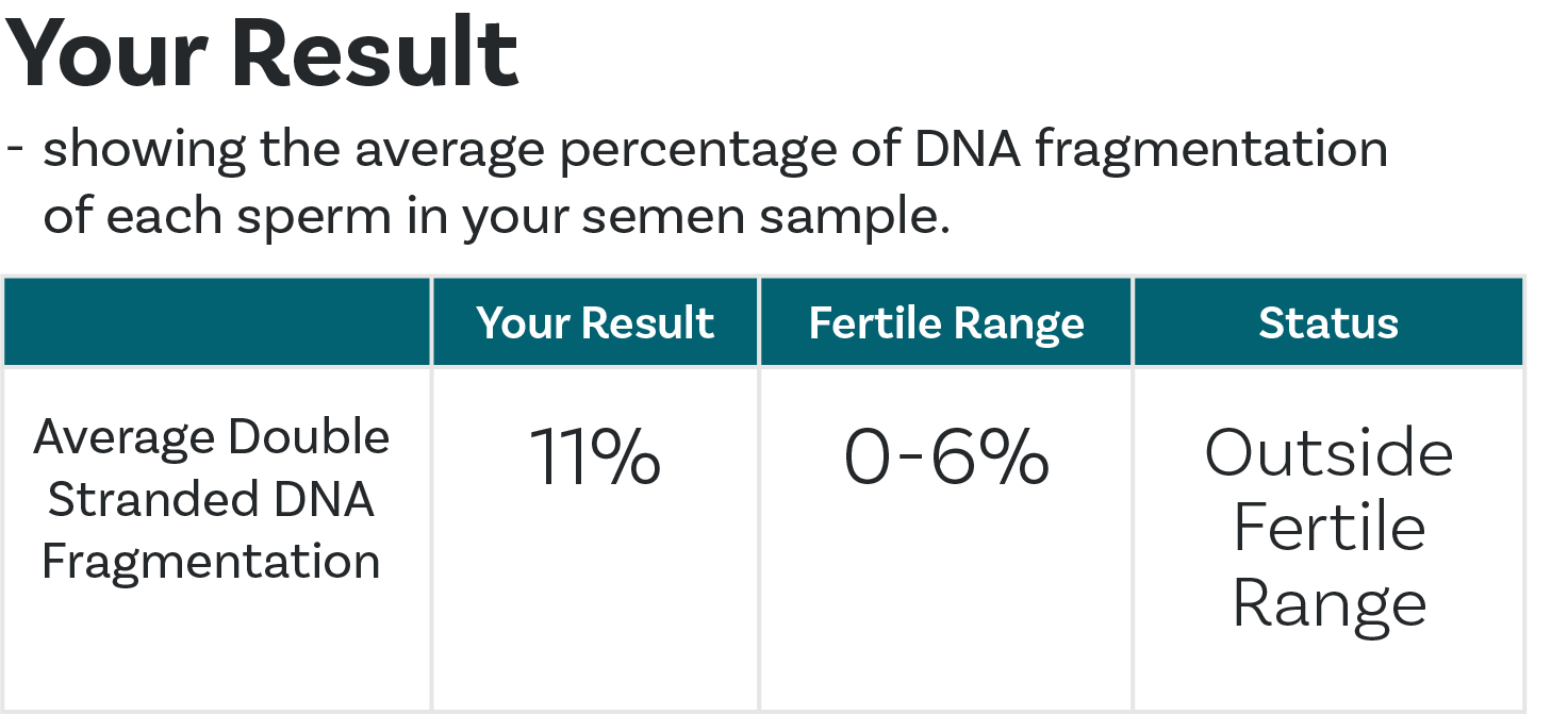 An Average Double Stranded SDF score between 0% to 6% is within the fertile range, whereas a score greater than 6% is outside this range and has an increased risk of infertility.