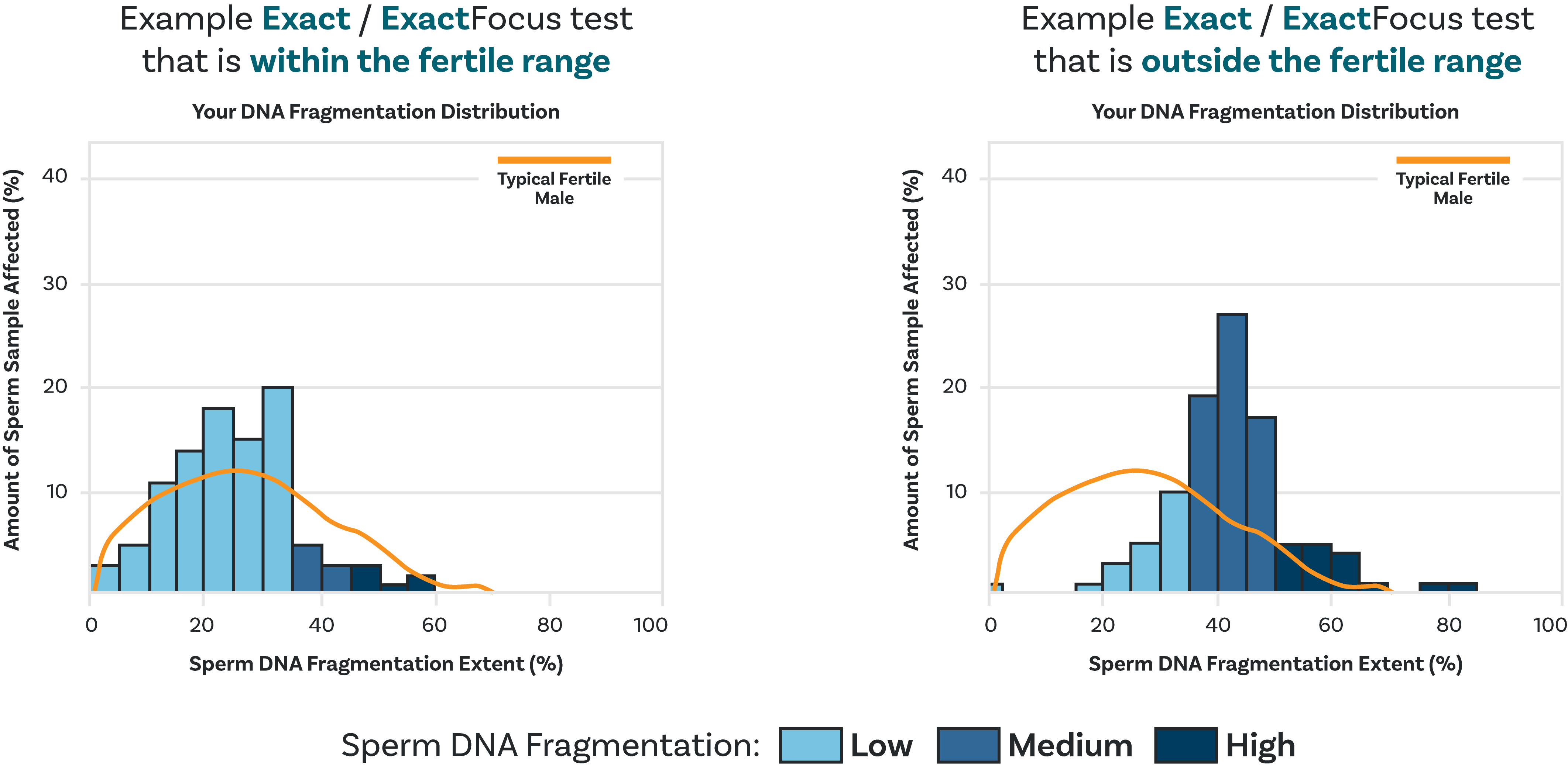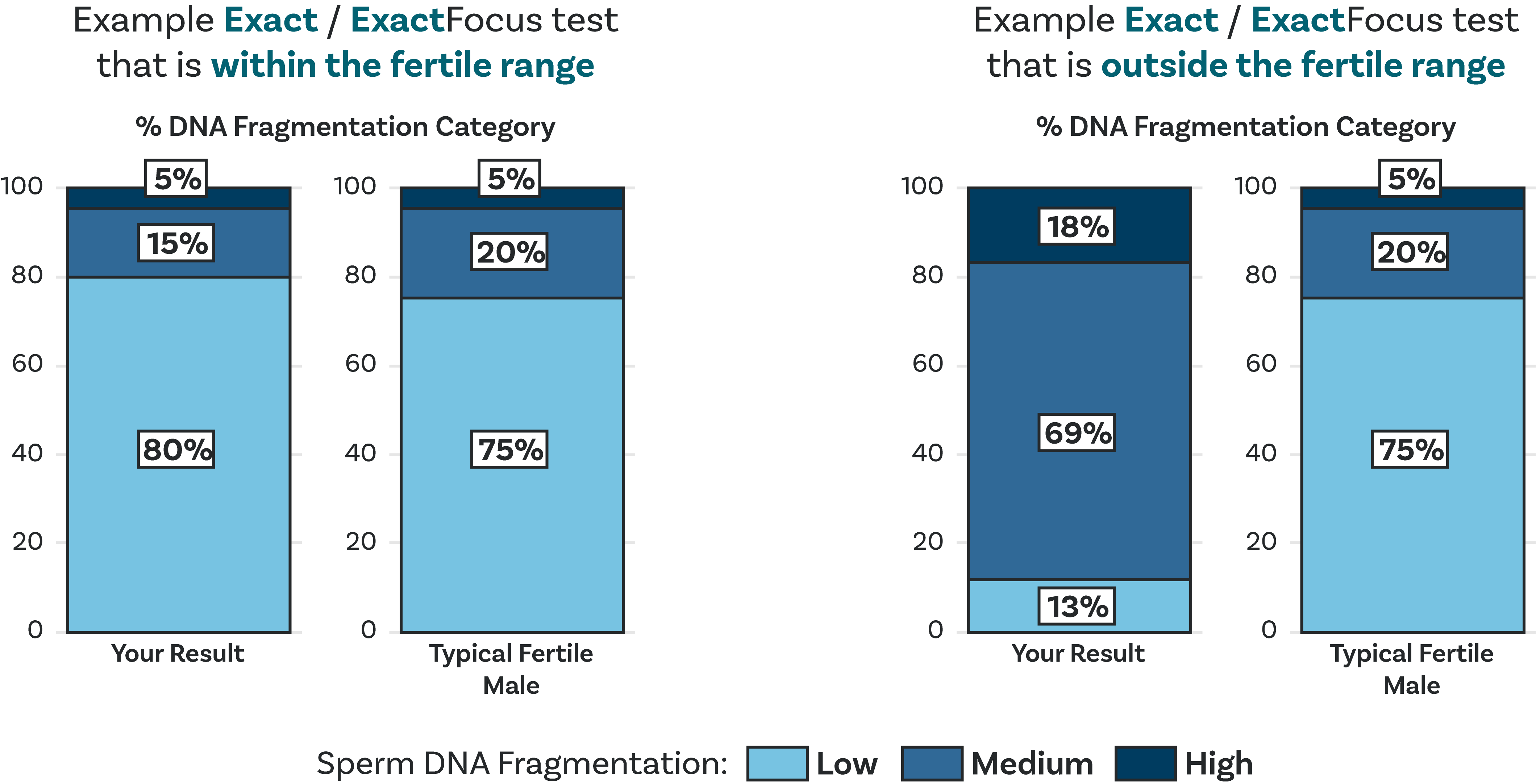 The Exact test result shows 3 different indicators of DNA fragmentation compared against a fertile reference range: